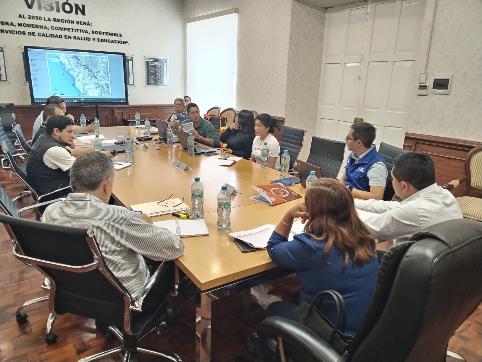La vicegobernadora Joana Cabrera Pimentel, a pedido del gobernador César Acuña Peralta, presidió una reunión de trabajo junto al gerente general Martín Namay, el gerente general adjunto, Rogger Ruiz, y funcionarios de las gerencias de Infraestructura, Defensa Nacional y Administración, para analizar todo lo avanzado a la fecha.