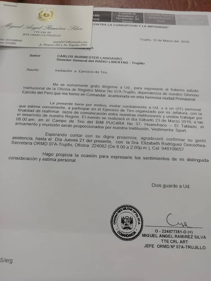 Invitación a Ejercicio de Tiro 20 marzo, 2019 radiolibertad Noticias 0 Cansados de la corrupción e impunidad reinante, hemos decidido ensayar nuestra puntería con armas de guerra. Director: Carlos Burmester Landauro.