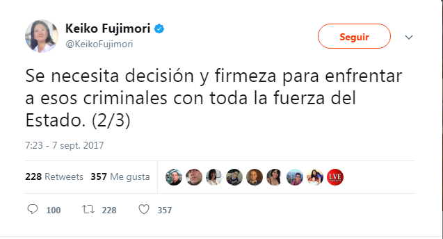 “Se necesita decisión y firmeza para enfrentar a esos criminales con toda la fuerza del Estado”, escribió Fujimori Higuchi en su cuenta de Twitter.