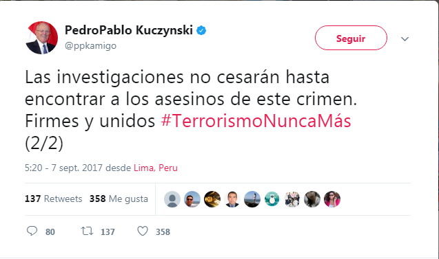 Más temprano, el presidente Pedro Pablo Kuczynski (PPK) indicó que “las investigaciones no cesarán hasta encontrar a los asesinos de este crimen”.