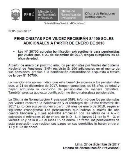 La entidad previsional nacional señaló que la Ley N° 30700 aprobó la entrega de esta bonificación extraordinaria para aquellos pensionistas por viudez que, al 21 de diciembre de 2017, tengan cumplidos los 65 años de edad.
