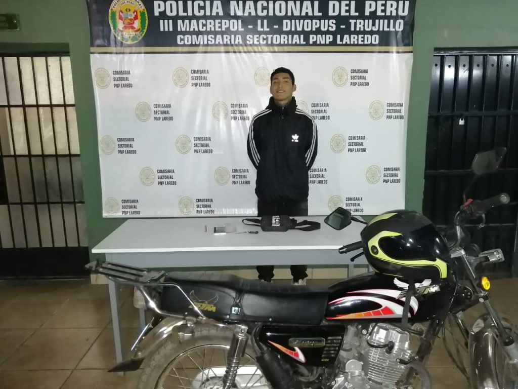Asimismo, el intervenido estaba acompañada de otro individuo, quienes luego de perpetrar el hecho se dieron a la fuga en el vehículo menor y tras tener conocimiento personal de la CPNP Laredo por parte del agraviado, se realizó el plan cerco para dar con el paradero de los delincuentes.